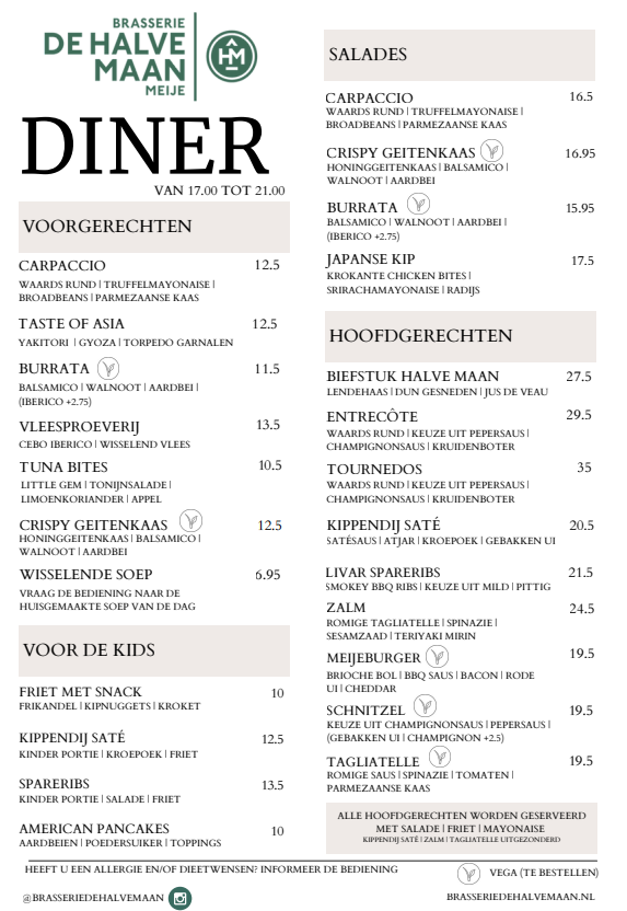 Momenteel nemen wij enkel reserveringen via de telefoon aan. Dus wilt u zeker zijn van een plekje in Brasserie de halve maan? Bel voor reservering naar 0614445511.